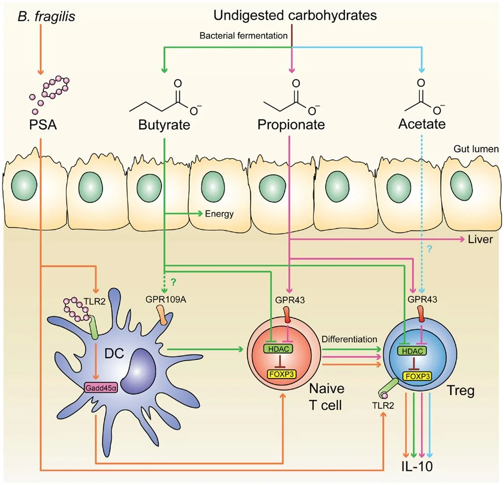 Short-chain fatty acid (SCFA)-producing bacteria, such as Clostridia and Bifidobacteria, play a crucial role in inducing Treg development as butyrate directly enhanced the polarisation of Treg cells but not Th17 cells (Smith et al., 2013). Patients with autoimmune diseases often exhibit lower levels of these beneficial bacteria, correlating with diminished Treg populations (Furusawa et al., 2013).